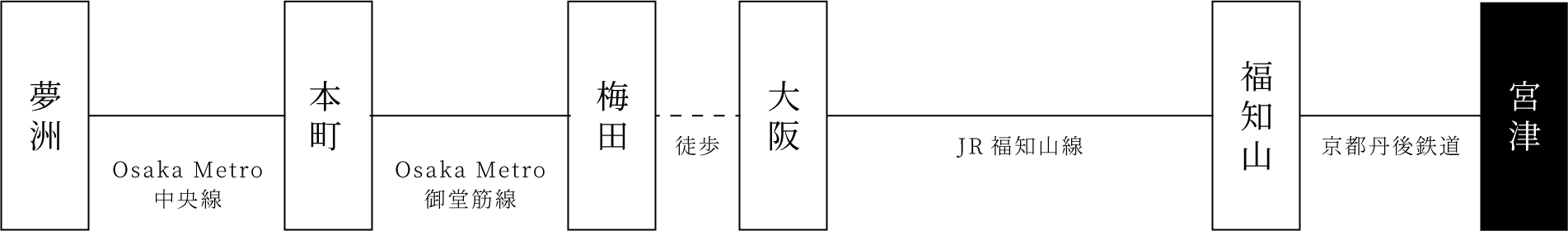 「梅田」駅下車、JR福知山線「大阪」駅乗車 → 「福知山」駅で京都丹後鉄道に乗り換え